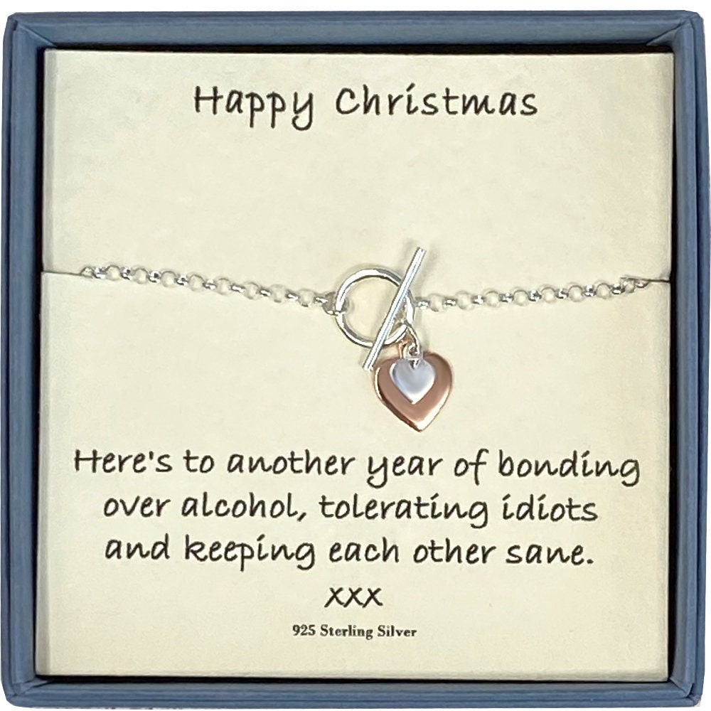 Comes in a gift box with a card message 'Happy Christmas Here's to another year of bonding over alcohol, tolerating idiots and keeping each other sane xxx' and a gift bag.