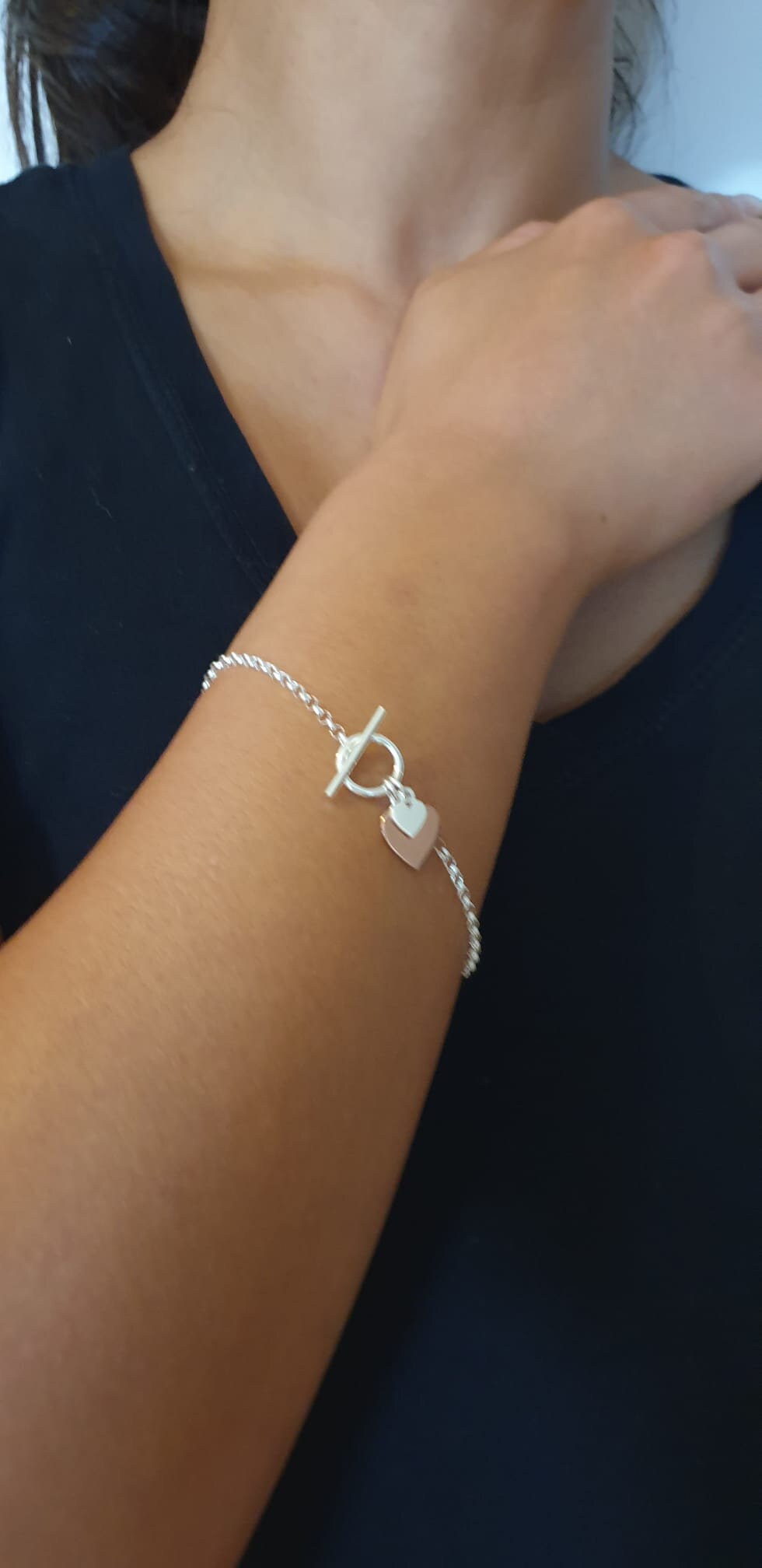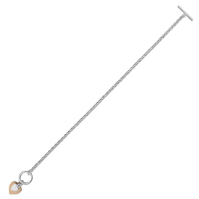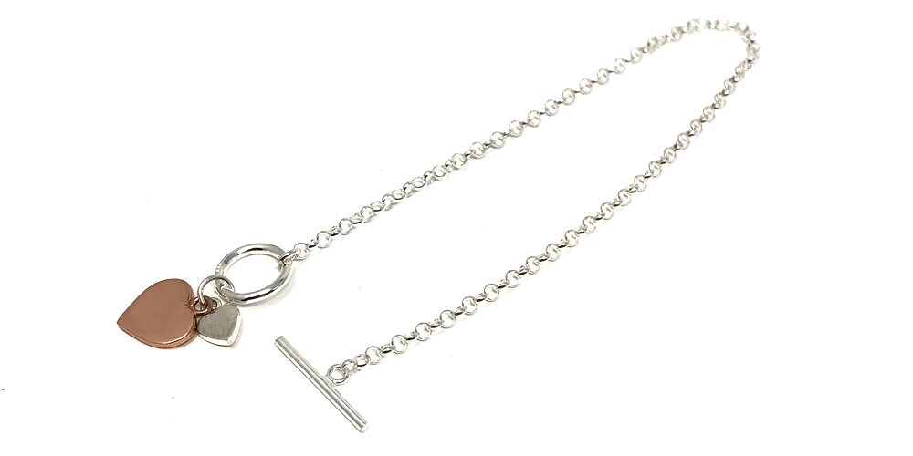 Designed in silver, this lovely design features a polished chain with a T bar fastener, a silver heart and a rose gold plated silver heart.