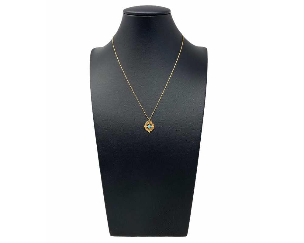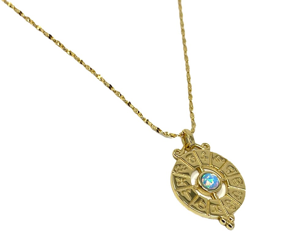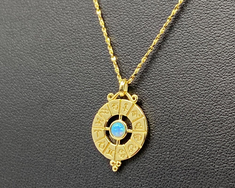 This is a beautiful ladies sterling silver zodiac disc pendant and necklace which is gold plated in 18ct gold. The pendant has inscribed the zodiac signs and has an Opal gemstone in the middle.