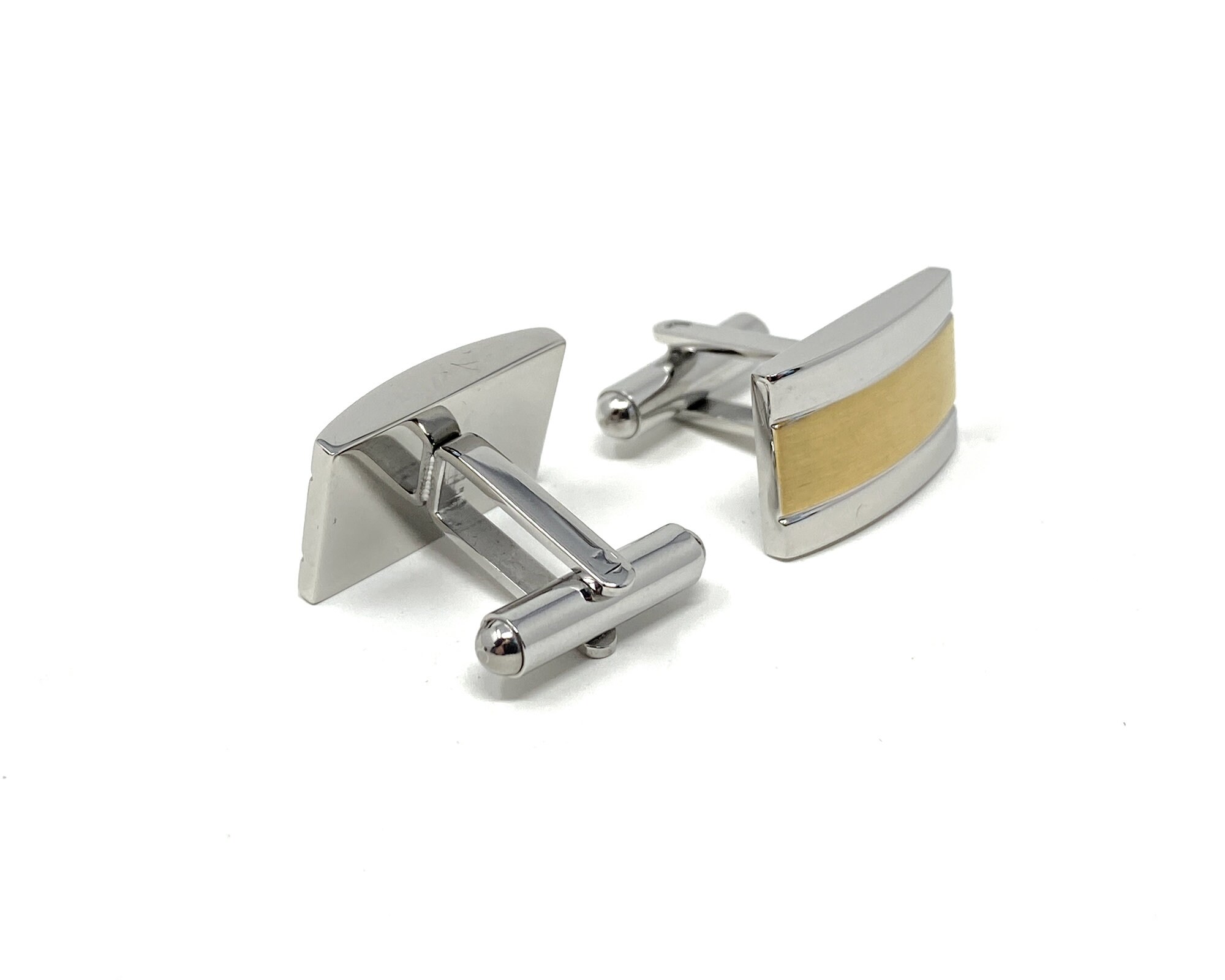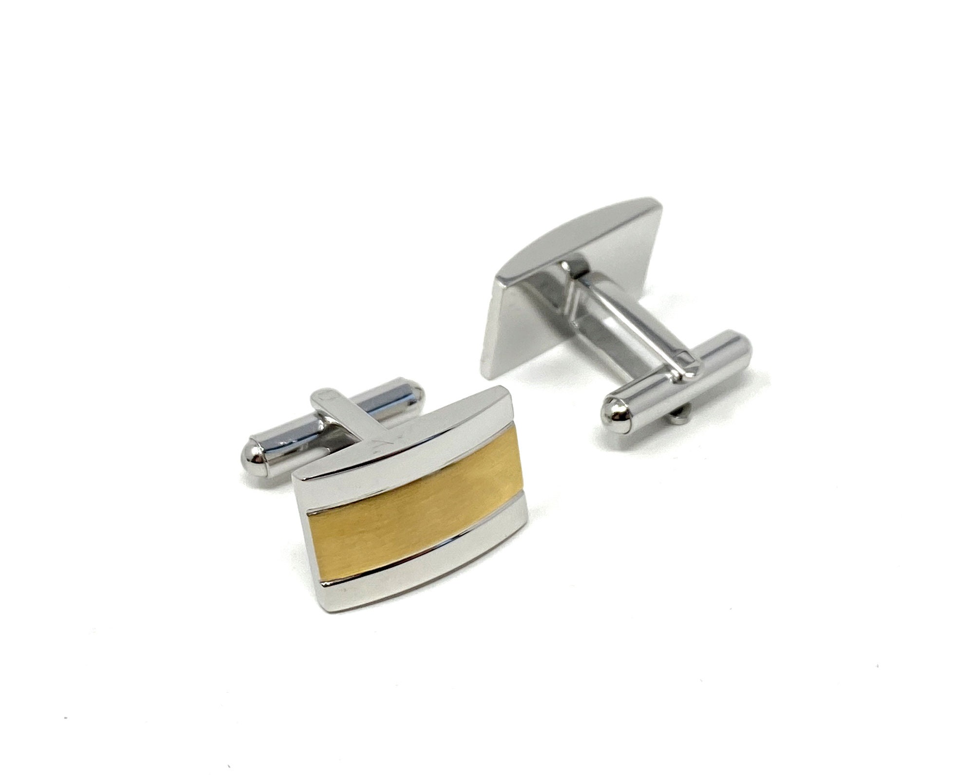 Men's stainless steel polished cufflinks are slightly curved and beautifully finished with a yellow gold plated band.