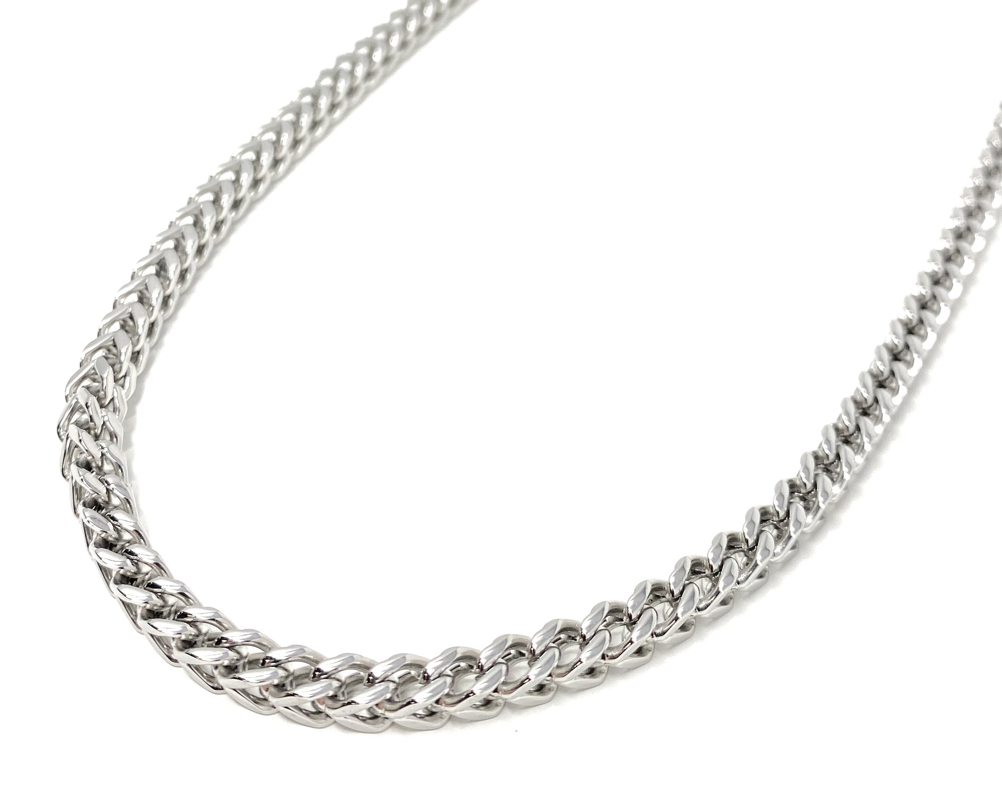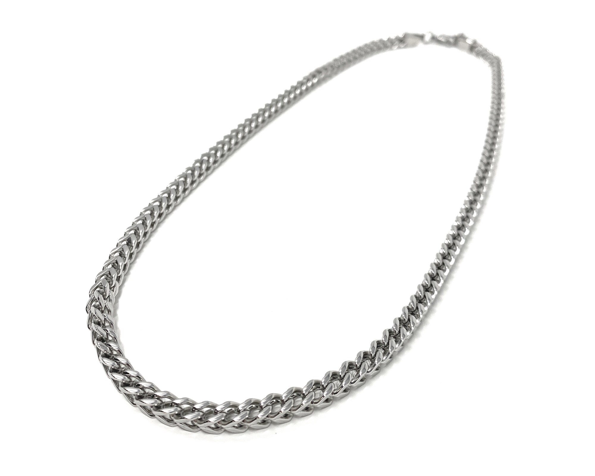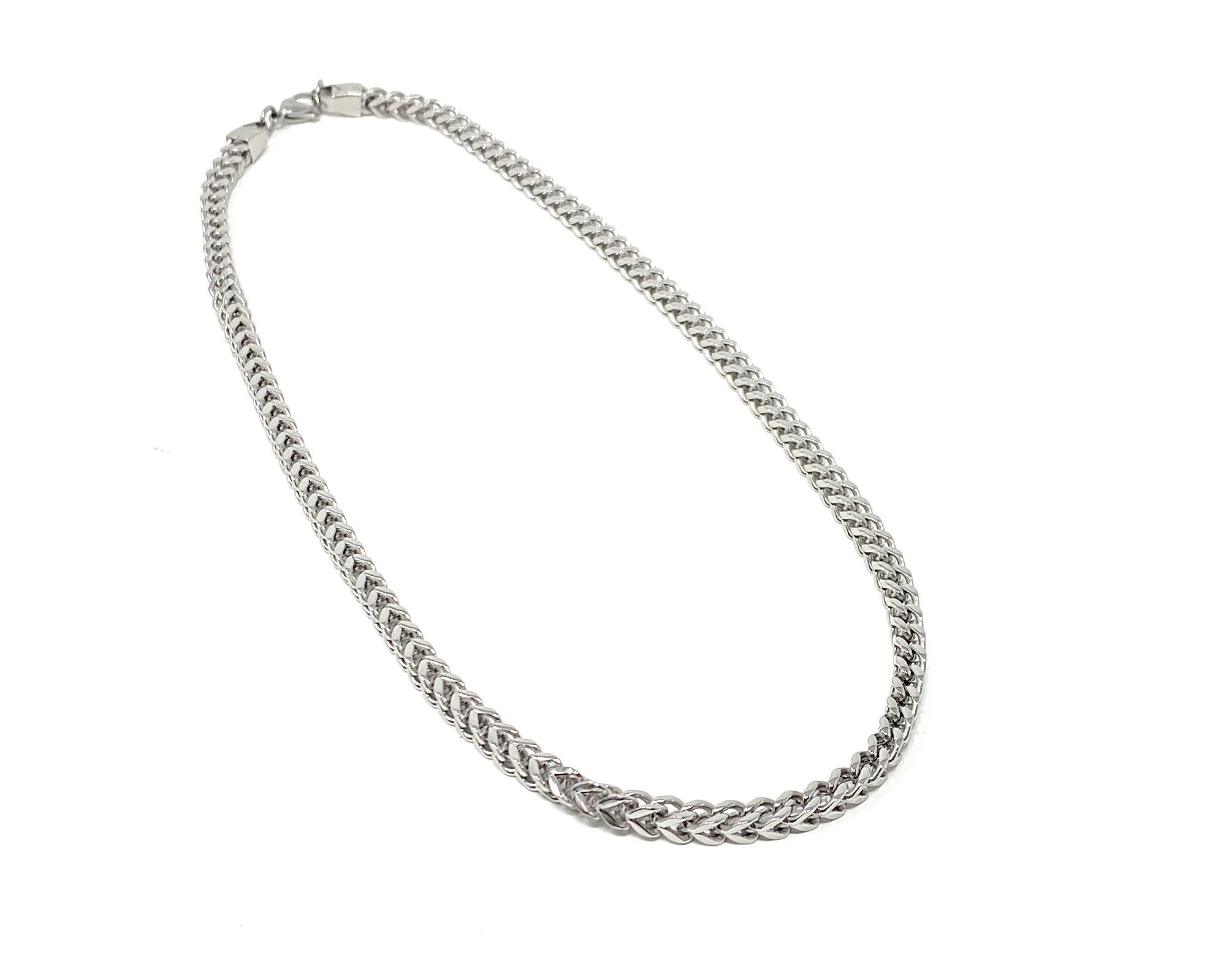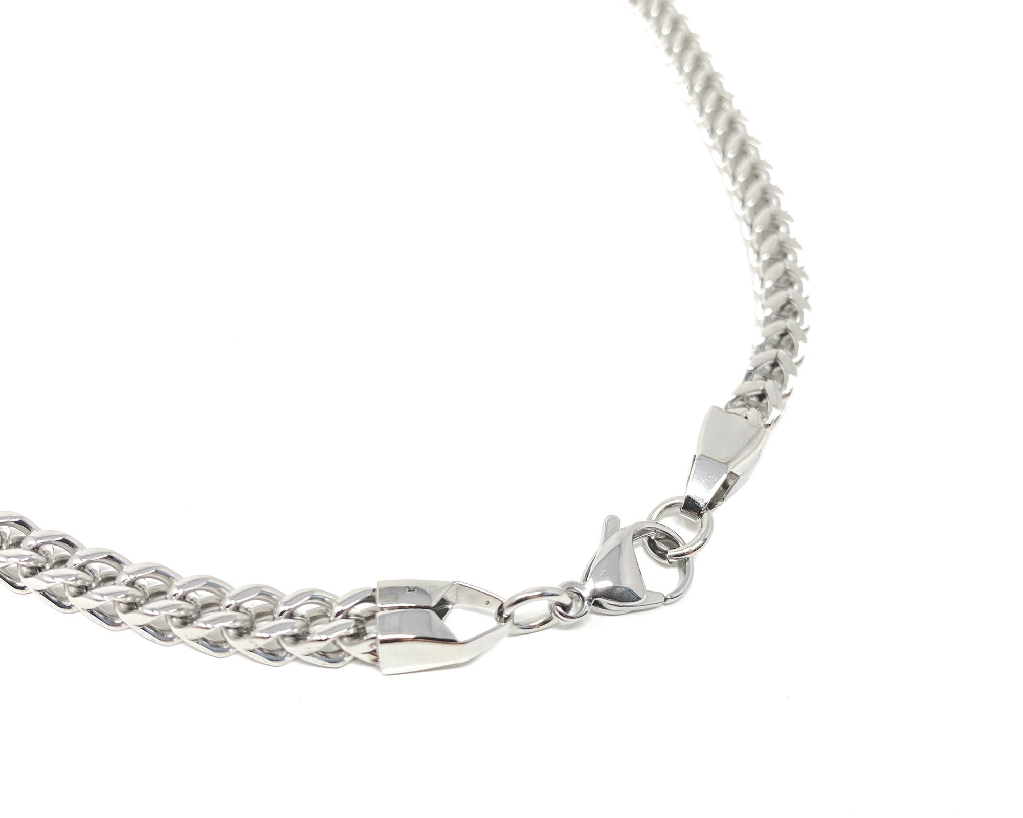 This stylish men's chain necklace has great detail in the square wheat weave chain design and is finished in polished stainless steel. Very well made, it sits perfectly on the neck.